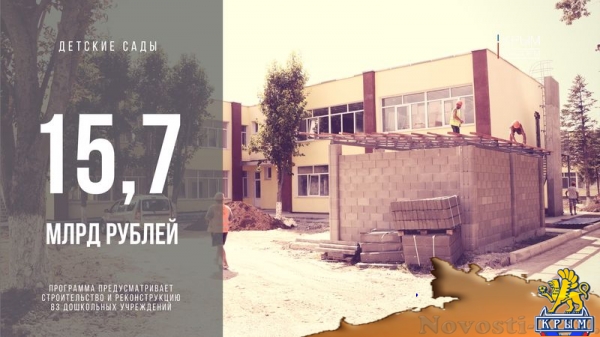 В 2015 году очередь в дошкольные учреждения Крыма составляла около 18 тысяч детей. Для решения дефицита мест в детских садах планировалось построить и восстановить десятки новых зданий. В прошлогодней редакции ФЦП на модернизацию дошкольного образования в Крыму выделялось 16,5 млрд рублей. Программа затрагивала 86 дошкольных учреждений. В новой редакции количество выделяемых средств сокращено до 15,7 млрд, а число объектов – до 83.