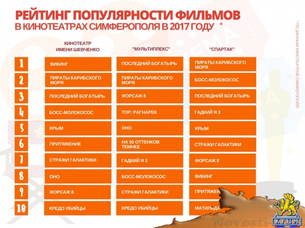Журналисты Крыминформа выяснили, какие картины больше всего понравились крымчанам. О выборе местных жителей рассказали в крупнейших кинотеатрах крымской столицы: в кинотеатре имени Т.Г. Шевченко, «Мультиплексе» и «Спартаке».