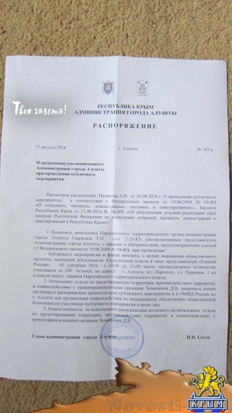 Уважаемые жители пгт. Партенит! В субботу 3 сентября в 10-00 на площади перед зданием поссовета состоится митинг. Целью данного публичного мероприятия является выражение недоверия местной власти в лице представителей партии «Единая Россия», занимающих руководящие посты в городской администрации и большинство депутатских кресел в горсовете Алушты. Митинг пройдет под лозунгами: «Власть игнорирует мнение жителей Партенита!», «Нет незаконной торговле в Партените!», «Нет грабительскому росту тарифов на воду!», «Единороссов-регионалов в отставку!». Организатор митинга - житель Партенита, главный редактор газеты «Твоя газета» Алексей Назимов. Проведение публичного мероприятия согласовано с муниципалитетом. Фото Распоряжения главы администрации города Алушты № 363-р от 25 августа 2016 года прилагается.
