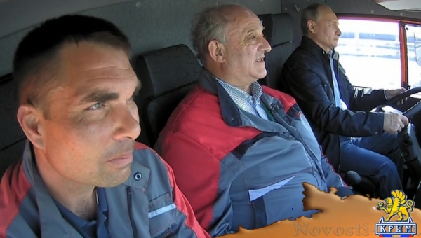 После этого ПУТИН сел за руль КамАЗа, находящегося во главе колонны строительной техники, и отправился по транспортному переходу. Колонна проехала 19 километров до крымского берега.