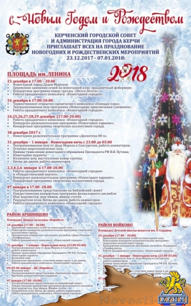В связи с проведением мероприятий, посвященных празднованию новогодних и рождественских праздников, в Керчи запрещается продажа алкогольной продукции за два часа до начала проведения, во время проведения и в течение одного часа после окончания мероприятий. Как сообщили в управлении экономического развития города, такие мероприятия пройдут с 23 декабря 2017 года по 7 января 2018 года по следующим адресам: