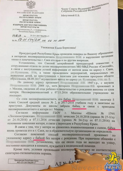 «Мать отказалась исполнять свои обязанности и написала, что она согласна с любым решением суда. Бабушка попросила хоть как-то помочь ей что-то сделать с мальчиком. Если бабушка подтвердит, что она может быть опекуном, то мы будем только рады. Сейчас она на основании отказа матери оформляет документы на ребенка и будет устраивать его в школу», – сообщила уполномоченный по правам детей по Крыму Ирина Клюева.