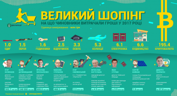 В 2017 году больше всего средств - более 195 млн. грн. - украинские госслужащие проинвестировали в криптовалюты, которые после резкого прошлогоднего подъема сейчас стремительно теряют в цене. Об этом свидетельствует исследование расходов в е-декларациях чиновников, которое провели аналитики проекта «Декларации» издания BIHUS.info, передает Центр журналистских расследований. «По итогам прошлого года, виртуальные ценности с бешеным отрывом одержали победу над материальными – больше всего средств (более 195 млн гривен) украинские госслужащие проинвестировали в криптовалюты. Бесспорным рекордсменом в этом стал депутат Одесского городского совета Дмитрий Палпатин. В августе он подал декларацию о существенных изменениях в имущественном состоянии, в котором указал 7711 биткоинив, что по тогдашнему курсу стоили почти 58 млн гривен », — пишет издание. Вторыми по популярности у чиновников оказались инвестиции в строительство — на стройматериалы чиновники потратили 6,6 млн. грн. Своеобразным трендом в этом стало также внедрение зеленых технологий — наряду с кирпичом, бетоном и металлопластиковыми окнами достаточно часто покупались солнечные панели и электростанции. Рекордсменом-строителем 2017 года стал председатель Петропавловской поселкового совета Днепропетровской области Сергей Войнов, который потратил более миллиона гривен на приобретение солнечной электростанции. Фото: bihus.info Не отставали чиновники и в погоне за техническим прогрессом — третьей по величине статьей расходов является электроника – 6,1 млн. грн. Победу в этой номинации получил благодаря своей профессиональной подозрительности бывший сотрудник СБУ, а ныне — депутат Киевского областного совета Иван Ступак, который приобрел два комплекса приборов для технической защиты персональной информации за почти 3,9 млн. грн. Кроме того, 5,3 млн. гривен потратили в 2017 году чиновники на предметы коллекционирования. Львиная доля этой суммы – 4,5 млн. грн. — приходится на долю народного депутата Вячеслава Богуслаева, который стал владельцем целой музейной коллекции экспонатов и макетов мотоциклов, двигателей и самолетов. Пятыми и шестыми по количеству потраченных средств оказались вещи нематериальные, а именно образование – 3,3 млн. грн. и путешествия и отдых – 2,5 млн. грн. Дороже всего стоит школа в США детей в. о. гендиректора «Укрпочты» Игоря Смелянского – 2,2 млн. грн. А лучший отпуск был в прошлом году у семьи председателя Одесской ОГА Максима Степанова — за авиабилеты и отдых губернатор заплатил 468 тыс. грн. Меньше денег в 2017 году госслужащие потратили на покупку часов – 1,6 млн. грн., оружия – 1,5 млн. грн. и брендовой одежды — 1 млн. грн.
