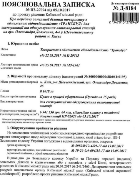 12 декабря 2017 года решение о выделении земельного участка ООО «Трансбуд» было принято земельной комиссией Киевсовета, говорится в заявлении киностудии им. Довженко, сообщает Центр журналистских расследований.