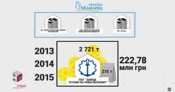Однако в 2013-2015 годах наравне с закупкой производственных материалов для своего промышленного производства «Кузница» в таких же промышленных масштабах покупает сыр и сухое молоко. По данным программы, за эти три года завод перечислил фирмам ЧП «Консалтинговая фирма «Прометей», ООО «Миргородский сыродельный комбинат» и ООО «Рось» (все три входили в группу компаний Milkiland) всего более 220 миллионов гривен за 2721 тонну сыра и 215 тонн сухого молока. Четверть этих закупок провели в один день – 31 декабря 2014 года. Тогда «Кузница» списала на сыр 52 миллиона гривен.