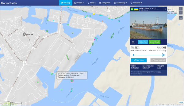 По состоянию на 16 часов судно Nefterudovoz 45 М стоит в акватории Херсонского морского торгового порта в районе Херсонской верфи Smart Maritime Group нардепа Вадима Новинского. Рядом с Nefterudovoz 45 м в сервисе Marinetraffic также видно портовое судно SO-3973, которое, вероятно, доставило сотрудников таможни.
