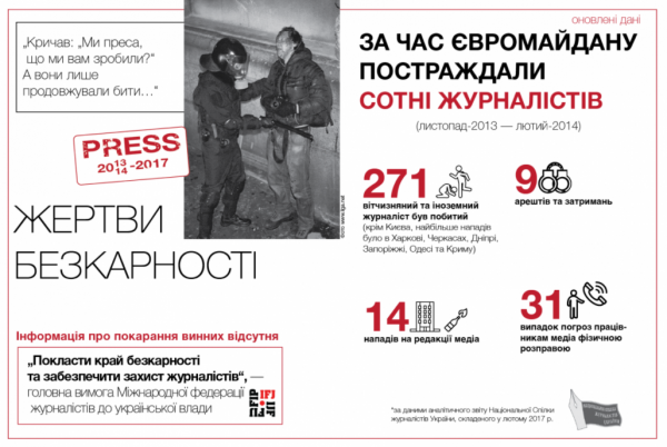 В НСЖУ констатировали, что и на четвертую годовщину крупнейших жертв во времена Революции Достоинства отсутствуют прецеденты наказания за жестокие избиения журналистов. При том, что в период с ноября 2013 года по февраль 2014 произошел 271 такой инцидент.