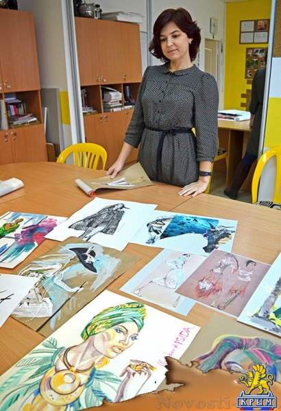 М.Маликова показывает эскизы
