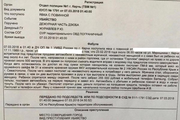Напомним, что семья Ларьковых в составе трех человек: Константина Ларькова , его жены Инны Ходаревой и их 4-летней дочери Арины, на автомобиле марки «Шевроле Ланос» рано утром 23 февраля выехали из своего дома в СТ "Волна" близ посёлка Орджоникидзе, после чего пропали без вести. Их искали почти две недели, и нашли в озере под Керчью. Константин Ларьков и его жена были расстреляны из пистолета, их дочь утонула, когда автомобиль столкнули в воду.