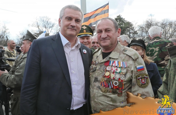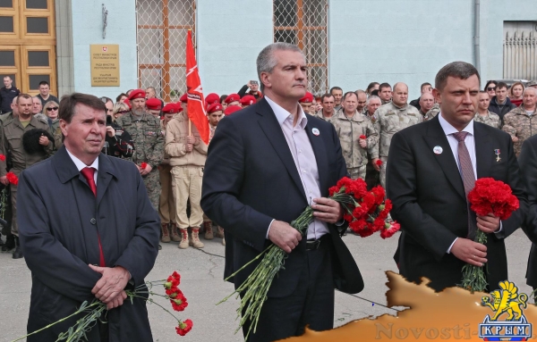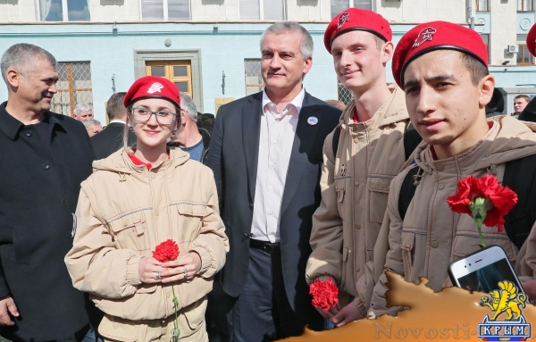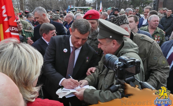 В ходе митинга к бойцам ДНР и ЛНР обратился и глава Крыма Сергей Аксёнов. «Сегодня мы встречаем наших друзей, наших братьев. Спасибо делегации из Донецкой республики во главе с Александром Владимировичем (Захарченко), который нашел время и приехал отметить вместе с нами этот знаковый для всех россиян день. Это дорогого стоит. Сегодня наши братья находятся на передовой Русского мира, им нелегко, но они благодаря своей настойчивости и вере в свою правоту и победу, с честью выполняют свой долг. Я уверен, что они справятся и как настоящие патриоты русской земли отстоят русский мир. Мы гордимся ими, их мужеством. Россия – Донбасс – Крым навсегда!» – подчеркнул глава Крыма.