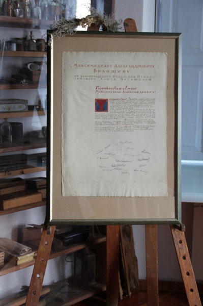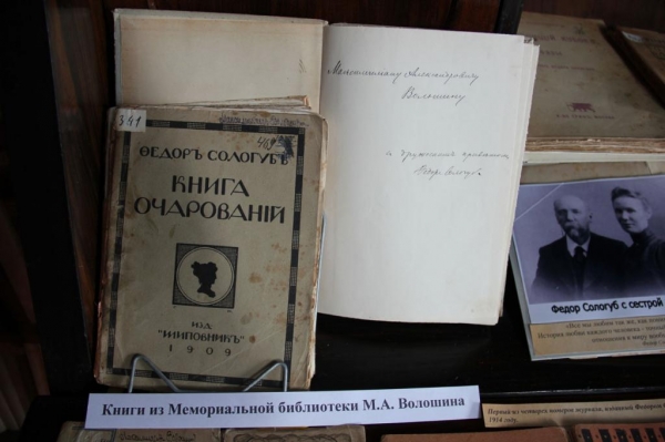 В фондах волошинского музея хранятся уникальные экспонаты, связанные с именем Федора Сологуба. Это архивные материалы, в том числе – вырезки из газет со статьями М.А. Волошина и поздравления (1925 год) к 30-летию литературной деятельности Максимилиана Волошина от Ленинградского отделения ВСП с подписью Ф. Сологуба, председателем которого Федор Кузьмич был избран в январе 1926 года. В мемориальной библиотеке поэта бережно хранятся книги, подаренные ему Сологубом с дарственными надписями. Так, один из автографов на книге из собрания сочинений писателя гласит: «Дорогому Максимилиану Александровичу Волошину с дружеским приветом. Федор Сологуб.».
