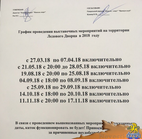 07-апр, 09:01 193 Новости АРК / СимферопольВ период с конца марта и до середины ноября текущего года в Ледовом дворце Симферополя будут проводиться выставочные мероприятия. В эти дни каток работать не будет.