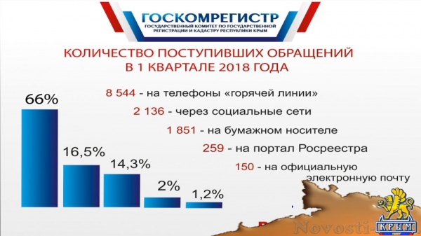 Larkins 11-апр, 08:01 193 Новости АРК / Экономика - Крыма.За первый квартал 2018 года в Государственный комитет по государственной регистрации и кадастру Республики Крым поступило почти 13 000 обращений граждан.