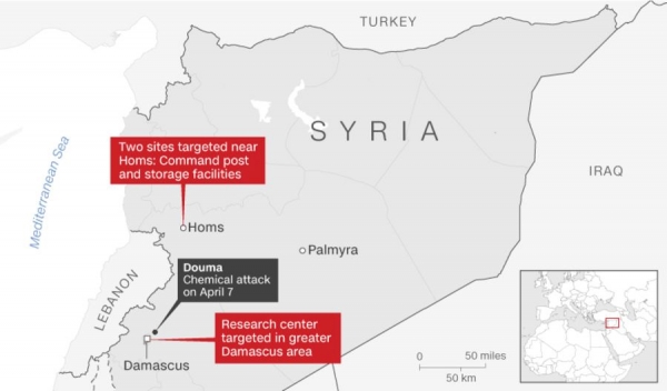 США, Британия и Франция нанесли удары по связанным с химическим оружием объектам в Сирии. Об этом пишет издание AP, передает Центр журналистских расследований. «Только что я приказал вооруженным силам США нанести точные удары по целям, связанным мощностями диктатора Башара Асада по производству химического оружия», — заявил Трамп. Сирия официально заявила, что союзники в ходе объединенной операции выпустили 110 ракет. «Наша воздушная оборона успешно сбила большинство из них», — заявил генерал Али Майхуб. По его словам, одна ракета попала в научно-исследовательый центр около Дамаска и разрушила здание. В Хомсе одну ракету сбили и в результате трое людей получили ранения. Майхуб заявил, что удар»не удержит сирийских военных от продолжения войны против «вооруженных террористов». Карта ударов, согласно официальным заявлениям: две цели около Хомса и научно-исследовательный центр около Дамаска. Российский «Коммерсант» со ссылкой на военные источники в Сирии сообщает, куда упали ракеты: — штаб Республиканской гвардии. Батальон 105 (Дамаск) — база ПВО, расположенная под горой Касьюн (Дамаск) — аэропорт Мезза (Дамаск) — аэропорт Ад-Думейр (Восточная Гута) — научно-военный центр в Барзе (район Дамаска) — штаб-квартира научного центра в Джамрайя в пригороде Дамаска — батальон 41 спецзназ (пригород Дамаска) — военные подразделения в Каламуне (северный пригород Дамаска) — военный объекты в Кисве (пригород Дамаска) — военные склады в Хомсе Британия нанесла удары по целям в Сирии для сдерживания использования химического оружия, заявила премьер-министр Тереза Мэй через несколько минут после того, как президент США Дональд Трамп объявил об атаках. Об этом сообщает Reuters. Британский премьер санкционировала высокоточные воздушные атаки, отметив, что альтернативы военным действиям не существует. Мэй заявила, что ракетные удары призваны минимизировать потери среди гражданского населения, они направлены на сдерживание дальнейшего использования химического оружия и не являются попыткой свергнуть сирийское правительство. Президент РФ Владимир Путин назвал удар США, Франции и Великобритании по целям в Сирии актом агрессии против суверенного государства. Россия созывает экстренное заседание Совета Безопасности ООН для обсуждения агрессивных действий США и их союзников. Глава Евросовета Дональд Туск заявил, что Евросоюз поддерживает действия США, Франции и Великобритании в Сирии. Утром в Дамаске прошла демонстрация в поддержку президента Башара Асада. Люди с флагами скандировали: «Мы твои люди Башар».