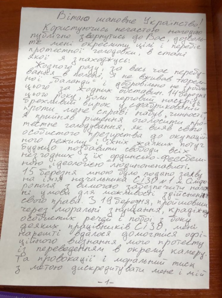 «Приветствую уважаемое Украинство! Пользуясь нечастым случаем обратиться к Вам, позвольте мне обозначить цели и ход протестной голодовки, в состоянии которой я нахожусь. Ни разу, за все время пребывания в плену, я не употреблял тюремной «баланды» и добровольно не сделаю этого ни при каких обстоятельствах. 14 марта этого года, когда очередной насквозь лживый приговор по сфабрикованному против меня делу вступил в «силу», я принял решение объявить голодовку протеста, как проявление своего личного презрения к оккупационному режиму и их жалких потуг во что бы то ни стало лишить свободы всех несогласных с их ордынского-феесбешной «идеологией» человеконенависти», — написал активист.