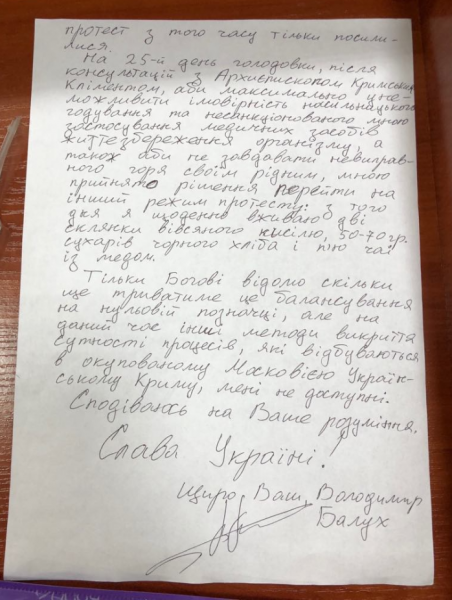 «На 25-й день голодовки после консультации с Архиепископом Крымским Климентом, чтобы максимально исключить вероятность насильственного кормления и несанкционированное мной применение медицинских средств жизнеобеспечения организма, а также, чтобы не наносить непоправимое горе своим родным, мной было принято решение перейти на другой режим протеста: с того дня я ежедневно употребляю два стакана овсяного киселя, 50-70 г сухарей из черного хлеба и пью чай с медом. Только Богу известно, сколько еще продлится это балансирование на нулевой отметке, но в настоящее время другие методы разоблачения сущности процессов, происходящих в оккупированном Московией украинском Крыму, мне недоступны. Надеюсь на Ваше понимание. Слава Украине!», — заявил Балух.