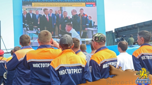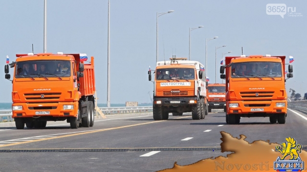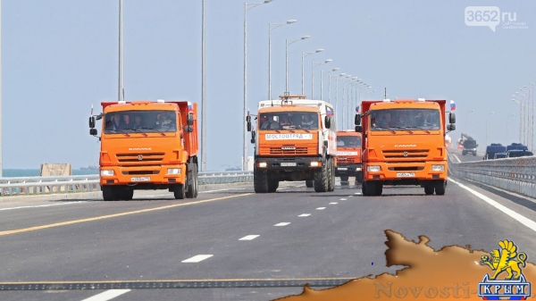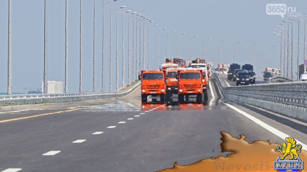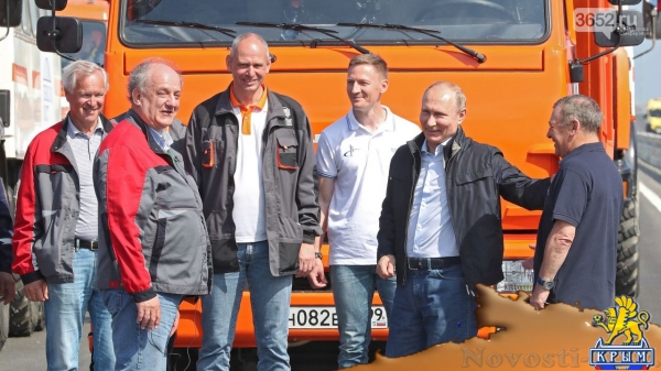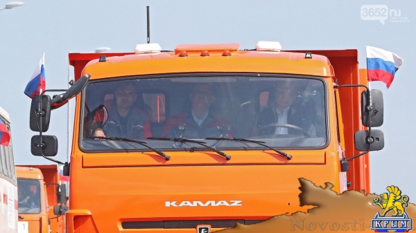 Напомним, что вчера 15 мая состоялось официальное открытие автодорожной части Крымского моста. Первой из Краснодарского края в Крым проехала колонна из 35 грузовиков. Колонну возглавил КамАЗ, которым управлял президент России Владимир Путин. Автомобили преодолели 19-километровый транспортный переход с одного берега Керченского пролива на другой за 21 минуту.