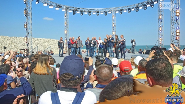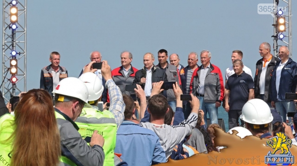 На другом конце 19-километрового моста, в Крыму, Путин принял участие в митинге-концерте по случаю открытия первой очереди транспортного перехода.