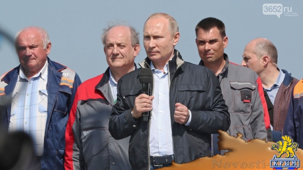 «Искренне поздравляю вас с этим замечательным, в полном смысле этого слова, историческим днём. Историческим, потому что в разные исторические эпохи, ещё при царе, люди мечтали о том, чтобы построить этот мост. Потом вернулись к этой идее в 30-е, 40-е, 50-е годы прошлого столетия. Наконец, благодаря вашему труду и таланту этот проект, это чудо свершилось», — сказал Путин.
