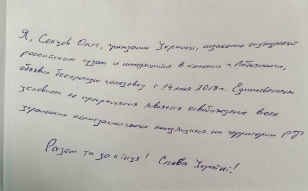 «Я, Сенцов Олег, гражданин Украины, незаконно осужденный российским судом и находящийся в колонии города Лабытнанги, объявил бессрочную голодовку с 14 мая 2018 года. Единственным условием ее прекращения является освобождение всех украинских политзаключенных, находящихся на территории России. Вместе и до конца. Слава Украине!», – написал Сенцов.