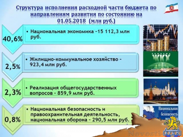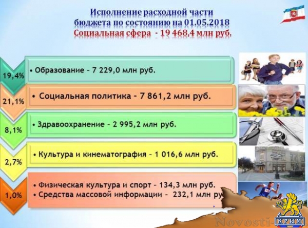 https://minfin.rk.gov.ruРасходы бюджета республики за первые 4 месяца года преодолели отметку в 37 млрд руб., что превысило прошлогодний показатель на 5,3 млрд руб., или на 16,6%. Об этом сообщила министр финансов Республики Крым Ирина Кивико. «Если в прошлом году за 4 месяца наши расходы составили почти 31,9 миллиардов, то в этом году это уже более 37 миллиардов рублей, то есть на 5 миллиардов больше. При этом годовые назначения выполнены на 21,4%», - отметила министр. Также руководитель финансового ведомства подчеркнула, что по итогам исполнения республиканского бюджета образовался профицит, а это значит, что доходы превысили расходы, а сумма превышения составила почти 2,3 млрд руб. За отчетный период, добавила Ирина Кивико, большая часть расходов, что составило 19,5 млрд руб., или 52,4% от общей суммы исполнения была направлена на финансирование отраслей социальной сферы. Более того, по сравнению с аналогичным показателем 2017 года расходы на эти цели выросли на 2 млрд руб. «В целом бюджет у нас социальный. Более 50% бюджета - это статьи социальной направленности: образование, здравоохранение, социальная политика, то есть поддержка ветеранов, инвалидов и других категорий граждан, которые в этом нуждаются», - подчеркнула Ирина Кивико. Министр уточнила, что на социальную политику направлено 7,9 млрд руб. (21,1% от общей суммы исполнения, превысило показатель прошлого года на 505,1 млн руб.); образование профинансировано в размере 7,2 млрд руб. (19,4% и на 1 млрд руб. соответственно); здравоохранение – почти на 3 млрд руб. (8,1%, на 79,3 млн руб. меньше показателя прошлого года); культура и кинематография – более 1 млрд руб. (2,7%, на 600 млн руб. больше, чем в прошлом году); средства массовой информации – на 232,1 млн руб. (0,6%, на 2,4 млн руб. меньше, чем в 2017 году); физическая культура – на 134,3 млн руб. (0,4%, на 13,7 млн руб. больше показателя прошлого года). Остальные расходы распределились следующим образом: - национальная экономика (развитие отраслей) – 15,1 млрд руб. (40,6% от общей суммы исполнения), что на 4,4 млрд руб. больше показателя 2017 года; - жилищно-коммунальное хозяйство – 923,4 млн руб. (2,5%), что меньше чем в прошлом году на 1,3 млрд руб.; - реализацию общегосударственных вопросов – почти 860 млн руб. (2,3%), снижение составило 311,5 млн руб.; - обеспечение национальной безопасности и правоохранительной деятельности – 290,5 млн руб. (0,8%), снижение составило 3,8 млн руб.Пресс-служба Министерства финансов РК Новости Минфина РК в Facebook, Twitter https://minfin.rk.gov.ru