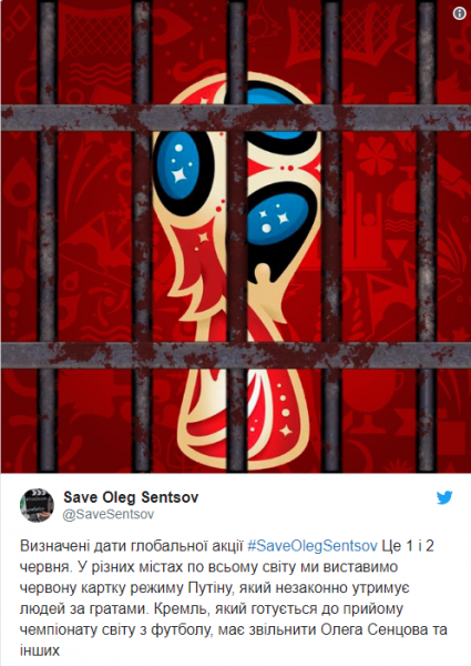 «Определены даты глобальной акции #SaveOlegSentsov. Это 1 и 2 июня. В разных городах по всему миру мы выставим красную карточку режима Путина, который незаконно удерживает людей за решеткой. Кремль, который готовится к приему Чемпионата мира по футболу, должен освободить Олега Сенцова и других», – говорится в сообщении активистов в сети Twitter.