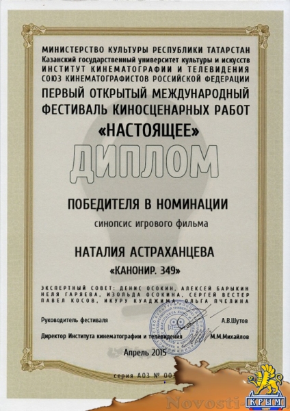 По мнению севастопольского автора Натальи Астраханцевой на фестивале кинопроектов «Победили вместе» у нее, по сути, украли сценарий. Ее история про героя первой обороны — Колю Пищенко — в итоге получила главный приз, но вместе с группой товарищей. Наталья Астраханцева Диплом Международного фестиваля киносценарных работ «Настоящее» в номинации «синопсис игрового фильма» за «Канонир.349» Свидетельство на депонирование результата интеллектуальной деятельности Н.Астраханцевой По мнению севастопольского автора Натальи Астраханцевой на фестивале кинопроектов «Победили вместе» у нее, по сути, украли сценарий. Ее история про героя первой обороны — Колю Пищенко — в итоге получила главный приз, но вместе с группой товарищей. О происшествии стало известно по сообщению в соцсети, где Н.Астраханцева сокрушается, что ее работу на фестивале кинопроектов «Победили вместе» представляют люди, которые не имеют к ее созданию никакого отношения. — О том, что мой сценарий выставлен на конкурс, я узнала за час до объявления победителей. Это наша тема, севастопольская, сценарий писался мною в течение нескольких лет, а его присвоили себе другие люди. Радость и боль одновременно — сценарий занял первое (!) место в номинации «Сделано в Крыму и Севастополе», он действительно хороший, с очень трогательной историей про героя первой обороны Севастополя Колю Пищенко. Могло бы получиться неплохое полнометражное кино, — делится Н.Астраханцева. Первый — «Бастион» Международный фестиваль документальных фильмов и телепрограмм «Победили вместе» прошел в Севастополе 15 и 16 мая уже в девятый раз. Он был создан севастопольцами как проект, объединяющий людей кино из СНГ — в память о победе в Великой Отечественной войне. В этот раз в его программу был включен конкурс сценариев, названный иностранным словом «питчинг». В рамках этого соревнования проходили презентации сценариев и синопсисов от молодых авторов. В списке полнометражных художественных фильмов Н.Астраханцева и обнаружила свой сценарий, которым неосторожно поделилась с режиссером и продюсером Юрием Тороховым из Перми еще в декабре 2015 года. Работу на фестивале представлял Арам Манукян, с которым писательницу познакомил тот же Ю.Торохов — в феврале 2017 года, представив Манукяна одаренным редактором. Именно этот молодой сценарист и был награжден как автор произведения о юном герое первой обороны Севастополя в 2018 году. «Первое место завоевала военно-историческая драма «Бастион». Его сценарий написан тремя авторами, самый юный из которых — Арам Манукян — блестяще защищал проект на питчинге. Это история об одиннадцатилетнем мальчике, в силу обстоятельств ставшем участником кровопролитного боя за Севастополь», — новость на сайте Союза кинематографистов РФ. Сама Н.Астраханцева упомянута в материалах к конкурсу как соавтор сценария на равных с Тороховым и Манукяном. Подтверждено: автор — Астраханцева С марта 2015 года Н.Астраханцева начала изучение истории и биографии 9-летнего героя первой обороны Севастополя. Она посещала местные библиотеки, изучала документальную и биографическую литературу, консультировалась с историками и закончила свой глобальный исследовательско-писательский труд в мае 2017 года. — Я подала документы на оформление прав по сценарию «Бастиона» в том виде, в котором я п