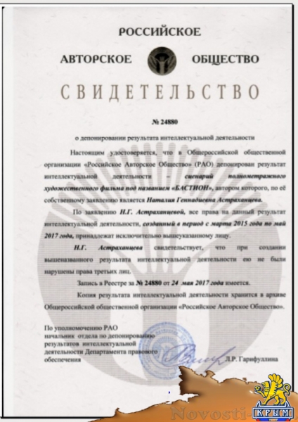 — Я подала документы на оформление прав по сценарию «Бастиона» в том виде, в котором я посчитала его законченным. Предоставила все исходники по работе над сценарием (с марта 2015-го по май 2017 года) на депонирование результата интеллектуальной деятельности, — рассказывает Н.Астраханцева.