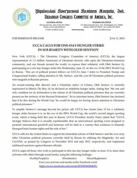 «Украинский конгрессовый комитет Америки (УККА), крупнейший представительный орган для 1,5 млн американцев украинского происхождения, призывает украинско-американское сообщество и наших друзей по всему миру выразить свою солидарность с Олегом Сенцовым, приняв участие в однодневном голодании в среду, 13 июня, накануне Кубка мира ФИФА в России», — отмечается в письме.