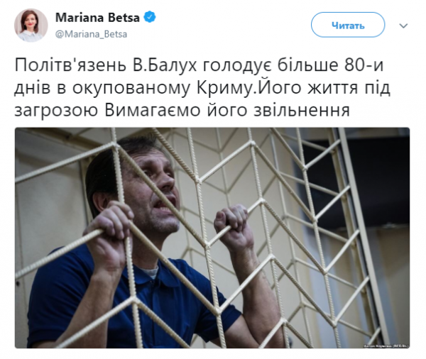 Жизнь украинского активиста Владимира Балуха, который продолжает голодовку в крымском СИЗО более 80 дней - под угрозой. 8 июня настал 82 день. Об этом напомнила пресс-секретарь МИД Марьяна Беца, передает Центр журналистских расследований. Как сообщалось, Балух надеется на обмен и возврат на материковую Украину. В то же время Российская Федерация пока не подтверждает готовность к переговорам. 6 июня адвокат Балуха Ольга Динзе сообщила, что он потерял 30 кг веса. Как сообщалось, 16 января 2018 года в Крыму «Раздольненский районный суд» приговорил Владимира Балуха по обвинению в якобы «хранении боеприпасов» к 3 годам и 7 месяцам колонии-поселения и штрафу в размере 10 тысяч рублей. 14 марта 2018 года «Верховный суд Крыма» изменил в части наказания приговор «Раздольненского райсуда» Балуху, уменьшив ему срок наказания на 2 месяца. 19 марта активист объявил бессрочную голодовку, протестуя против незаконного приговора. 19 марта «Раздольненский райсуд» избрал для Балуха меру пресечения в виде содержания под стражей до 19 июня в уголовном деле по обвинению в якобы «дезорганизации деятельности» Раздольненского ИВС. 5 апреля «Верховный суд Крыма» оставил без изменений меру пресечения в виде ареста для активиста. Напомним, 22 августа 2017 года в Крыму против Владимира Балуха возбудили еще одно уголовное дело якобы за нападение на начальника Раздольненского ИВС, который сам оскорблял и ударил украинца. 6 декабря 2017 года Владимиру Балуху вручили постановление о привлечении в качестве обвиняемого по ч.2 ст.321 УК РФ (дезорганизация деятельности учреждений, обеспечивающих изоляцию от общества). 2 апреля «Раздольненский районный суд» разрешил архиепископу Симферопольскому и Крымскому УПЦ КП Клименту стать общественным защитником на процессе по обвинению Владимира Балуха в якобы «дезорганизации деятельности» Раздольненского ИВС. Владыка попросил активиста отказаться от голодовки и начать принимать пищу, чтобы не повредить здоровью.
