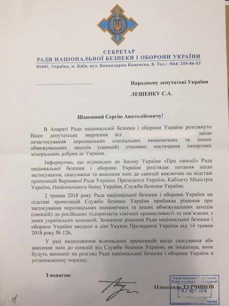 В документе утверждается, что решение о применении персональных экономических и других ограничительных мер к российским предприятиям химической промышленности и связанным с ними украинским компаниям СНБО принял на основании предложений СБУ.