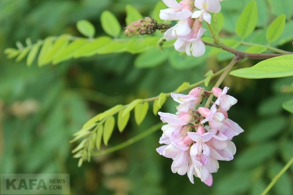 Робиния клейкая зацветает на несколько дней позже Робинии лжеакации (Robinia pseudoacacia), или белой акации, как ее еще называют. Через пару недель белая отцветает, а розовая, сделав паузу недели на 2-3, зацветает снова, и может цвести на протяжении всего лета, и даже осенью, если летняя жара не высушит нежные розовые кисти.