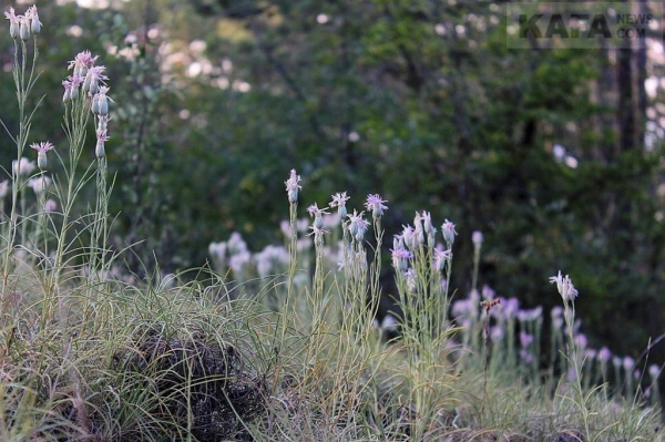 Стоит отметить, что на склонах горы, не смотря на жару, палящее солнце не выжгло все травы. То тут, то там, пусть небольшие, невысокие, слабенькие, но зеленеют и даже умудряются цвести различные травянистые жители хребта. Добравшись до сосновых посадок, долго любуешься непритязательными, и, тем не менее, привлекательными своей грациозностью, нежно лиловыми соцветиями Наголоватки лавандолистной (Jurinea stoechadifolia). Целая полянка ее тянется вверх тонкими стебельками под защитой многолетних сосен.
