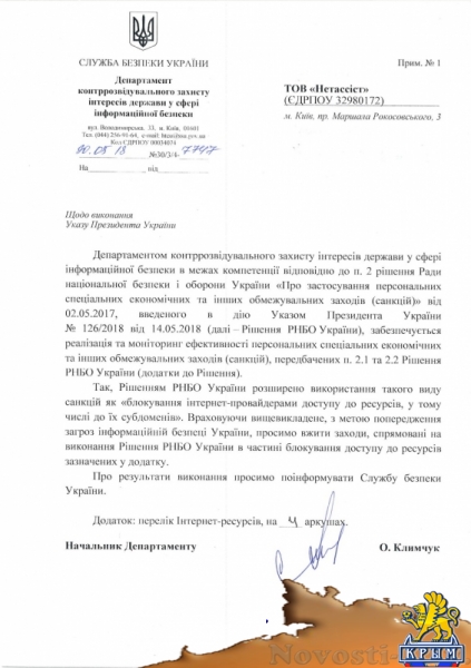 В тексте письма от СБУ отмечается, что "заблокировать Интернет-ресурсы необходимо в рамках исполнения решения СНБО о введении санкций от 2 мая 2017 года, который ввел в действие указом президент Украины Петр Порошенко 14 мая 2018 года".