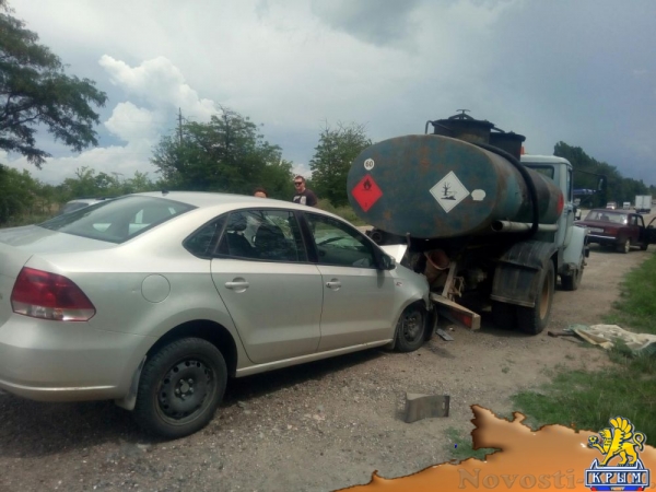 Крым ДТП https://3652.ruДнем в понедельник, 16 июля, на трассе Симферополь-Джанкой легковой автомобиль врезался в бензовоз. Об этом сообщают очевидцы, передает корреспондент 3652.ru. Со слов свидетелей ДТП, бензовоз стоял на обочине из-за поломки, при этом водитель выставил знак аварийной остановки. В машину врезался "Volkswagen", за рулем которого находилась женщина. Очевидцы утверждают, что она был сильно пьяна. "Стоял с разобранным кардану, на аварийке, со знаком - все как надо. Женщина за рулем или уснула, или вильнула руля и подвинула меня на 1,5 метра. Экспертиза на Февральской показала в 11 раз больше нормы алкоголя", - рассказал водитель бензовоза. К счастью, обошлось без жертв. Крым ДТП https://3652.ru