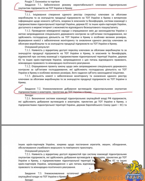 Отдельным пунктом идет обеспечение нерентабельности ключевых предприятий крымской экономики, создание условий, при которых станет невозможной добыча углеводородов в акваториях, прилегающих к полуострову, противодействие экспорту и импорту товаров и услуг в и из Крыма в иностранные государства.