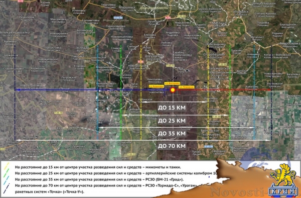 На первом этапе стороны должны развести силы и средства на трёх пилотных участках,то есть в Петровском, Золотом и Станице Луганской, на расстояние, предусмотренное Рамочным решением. А на втором этапе стороны в пределах установленной ширины участка отводят тяжелое вооружение в соответствии с его тактико-техническими характеристиками согласно Комплексу мер и Дополнению к Комплексу мер. То есть миномёты и танки отводят на расстояние 15 километров, артиллерию калибром 100 миллиметров и более – на расстояние 25 километров, РСЗО «Град» – на 35 километров и РСЗО «Торнадо-С», «Ураган», «Смерч» и тактических ракетных систем «Точка» на 75 километров.