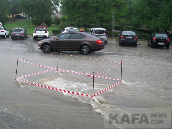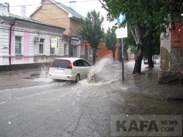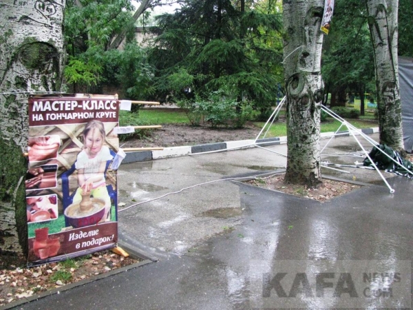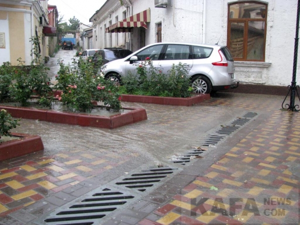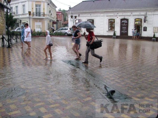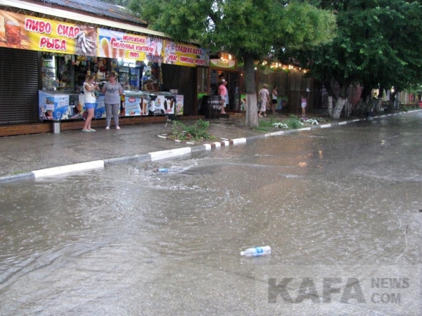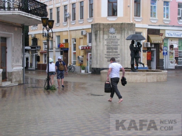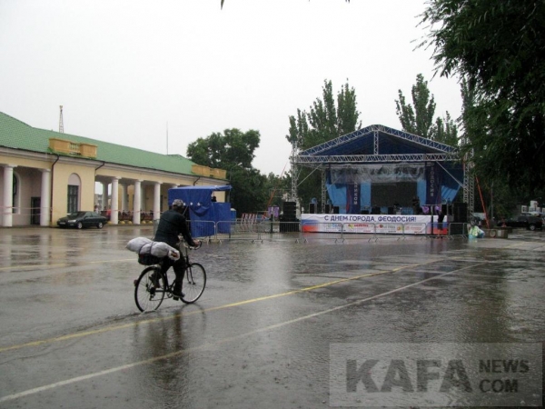 Начавшись, согласно прогнозам синоптиков, ровно в 09:00, ливень разогнал с основных праздничных площадок тех людей, которые уже готовы были к радости и веселью, - вопреки ожиданиям, все бежали не к Привокзальной площади города, а подальше от нее. Главная праздничная сцена скрылась от немногих прохожих за дождевой стеной и о том, что Феодосия отмечает сегодня свой день рождения, можно было догадаться только по изредка бросающимся в глаза плакатам с поздравительными лозунгами.
