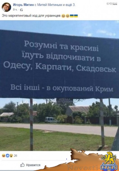 Билборды, которые высмеивают тех граждан Украинцы, что отдыхают в Крыму, появились на улицах украинских городов. Житель Киева Игорь МИТИН опубликовал в своем блоге фотографию, на которой видно плакат, где на украинском языке неуважительно оценивается выбор места отдыха, сделанный украинцами. «Умные и красивые едут отдыхать в Одессу, Карпаты, Скадовск. Все остальные — в оккупированный Крым», – гласит надпись на плакате. http://an-crimea.ru