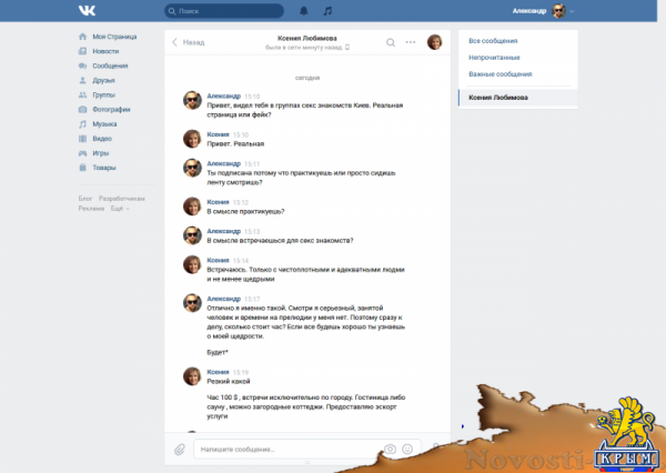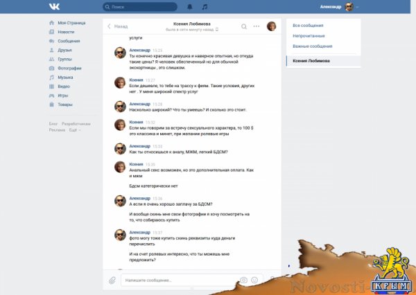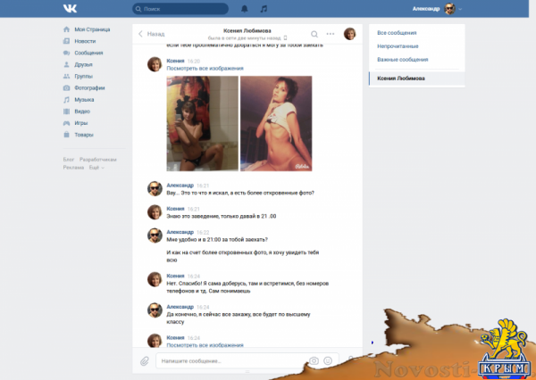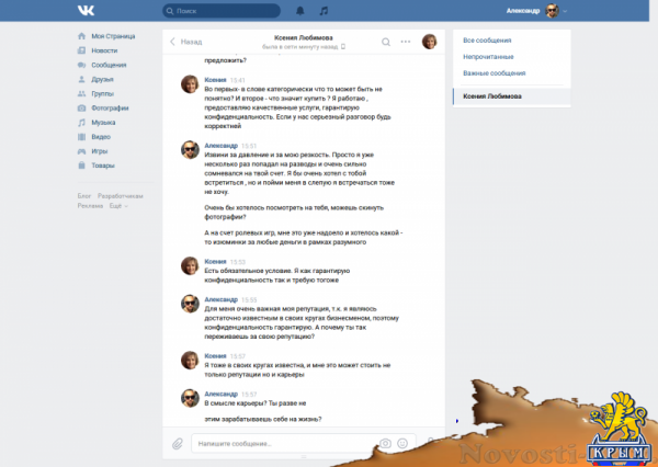 В эфире телеканала были выложены скрины переписки Ксении с неким Александром, в которой обсуждаются подробности интимных платных встреч.