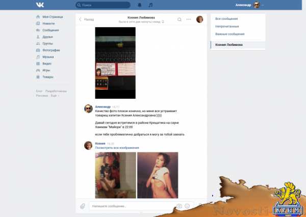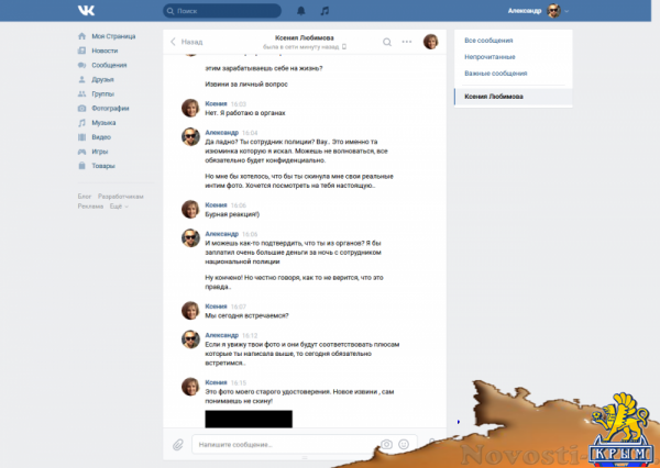 «Вот, к примеру, переписка пани Шевчук, которая зашифрована под фамилией «Любимова» с неким Александром. Девушка стоит не так уж и дешево – 100 долларов час, особые изыски – за дополнительную плату. Полицейская жрица любви не шифруется, признается клиенту в том, что работает в полиции и даже фотографирует своё удостоверение. То, что это действительно Шевчук можно понять по многочисленным фото интимного характера. На удостоверении и на фото – одно и то же лицо. Правда, выражение этого самого государственного лица на этих самых фото очень разное», – установили луганские журналисты.