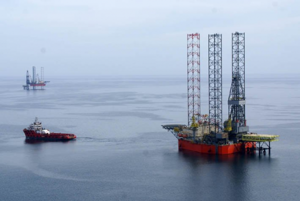 СПБУ «Украина» («Независимость»), на дальнем плане СПБУ «Петр Годованец» ГАО «Черноморнефтегаз» на Одесском месторождении 2013 г.