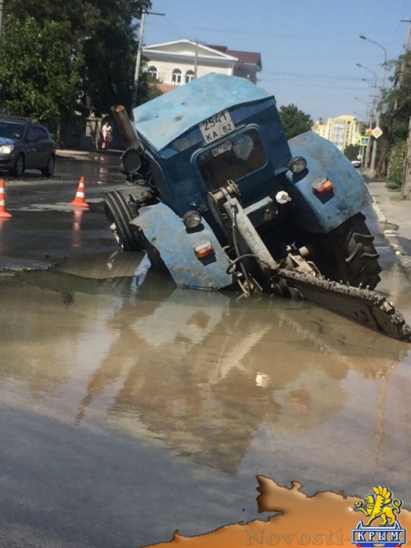 В Симферополе трактор проломил асфальтное покрытие и провалился в яму. Об этом сообщают очевидцы в социальных сетях, они также разместили фото с места инцидента. Пользователи отмечают, что происшествие произошло на улице 51-армии. В результате падения трактор повредил водопровод. Пользователи утверждают, что улица 51-армии и прилегающие к ней были залиты водой. Напомним, из-за аварии часть крымской столицы осталась без воды на целые сутки. http://an-crimea.ru