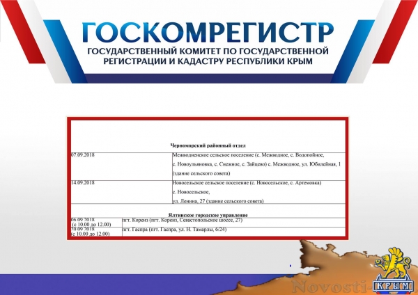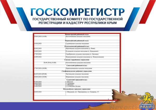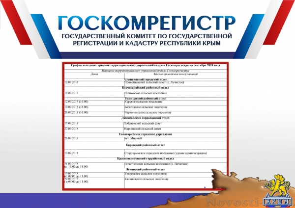https://gkreg.rk.gov.ruВ сентябре серия выездных приемов граждан специалистами Государственного комитета по государственной регистрации и кадастру Республики Крым начнется с Раздольненского района. Об этом сообщил председатель Госкомрегистра Александр Спиридонов. В следующем месяце консультации по вопросам учетно-регистрационной сферы смогут получить жители 31 муниципального образования по всей Республике Крым. Первое поселение, которое посетят сотрудники регистрирующего органа — Березовское сельское поселение (с. Нива). «В последних числах каждого месяца в Госкомрегистре составляется список выездов для оказания методической помощи гражданам из отдаленных крымских регионов. Актуальный план консультаций уже можно посмотреть на Портале Правительства Республики Крым и на наших официальных страницах в социальных сетях. Приемы проходят непосредственно на территории населенных пунктов, обычно в здании местной администрации, то есть людям не нужно выезжать за пределы своего поселения», — рассказал председатель комитета. Александр Спиридонов также напомнил, что получить информацию справочного характера по вопросам регистрации прав на недвижимое имущество и кадастрового учета можно в справочной службе комитета . https://gkreg.rk.gov.ru
