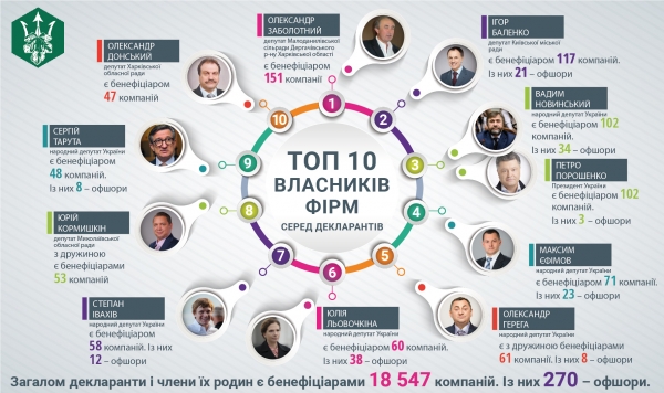 «Третью строчку поделили между собой народный депутат Вадим Новинский и президент Украины Петр Порошенко. Каждый из них задекларировал по 102 компании. 34 фирмы Новинский зарегистрировал в таких оффшорных юрисдикциях как Кипр, Британские Виргинские острова, остров Джерси. Порошенко в свою очередь владеет 3 оффшорами — двумя на Кипре и одним на Виргинах», — говорится в исследовании.