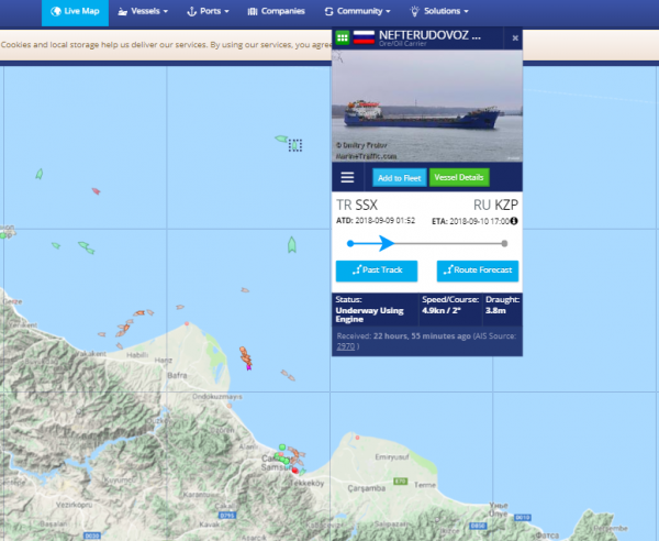 Судно «Нефтерудовоз-50М» в турецком порту Самсун 10 сентября приняло на борт груз украинского ильменита и следует в порт Кавказ, что на российском берегу Керченского пролива. Отметим, что три предыдущих рейса «Нефтерудовоз-50М» доставлял ильменит непосредственно к участку Камыш-Бурун порта Керчь в оккупированном Крыму.