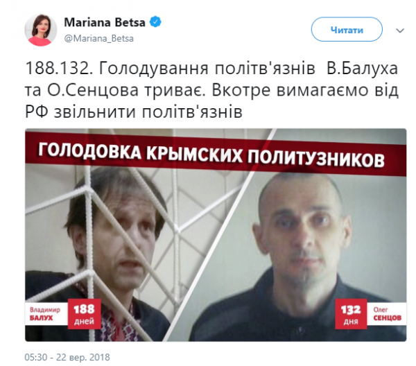 «Голодовки политзаключенных В. Балуха и О. Сенцова продолжаются. В очередной раз требуем от России освободить политзаключенных», – написала Беца.
