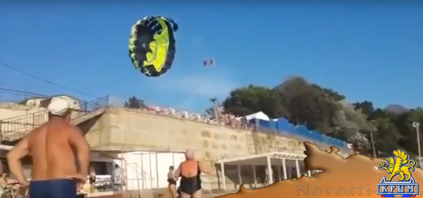Инцидент успели запечатлеть и другие туристы, отдыхавшие на побережье Черного моря. На видео видно, как в какой-то момент летящую пару начало уносить ветром в сторону ЛЭП.