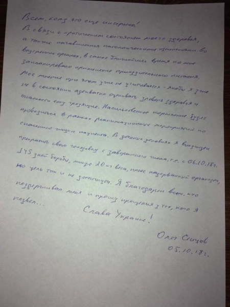 Незаконно осужденный в России украинский режиссер, крымчанин Олег Сенцов сообщил в письме, что вынужден прекратить голодовку в субботу, 6 октября, из-за угрозы принудительного кормления, поскольку состояние его здоровья оценивается как критическое. Олег Сенцов Письмо Олега Сенцова, которое передал из российской колонии после встречи с украинцем адвокат Дмитрий Динзе, опубликовал в соцсети Facebook корреспондент Радио Свобода журналист Антон Наумлюк , сообщает Центр журналистских расследований . Содержание письма Олега Сенцова: «В связи с критическим состоянием моего здоровья, а также начавшимися патологическими изменениями во внутренних органах, в самое ближайшее время ко мне запланировано применение принудительного питания. Мое мнение при этом уже не учитывается — якобы я уже не в состоянии адекватно оценивать уровень здоровья и опасности ему грозящие. Насильственное кормление будет проводиться в рамках реанимационных мероприятий по спасению жизни пациента. В данных условиях я вынужден прекратить свою голодовку с завтрашнего числа, т.е. с 06.10.18 г. 145 дней борьбы, минус 20 кг веса, плюс подорванный организм, но цель так и не достигнута. Я благодарен всем, кто поддерживал меня и прошу прощения у тех, кого я подвел… Слава Украине! Олег Сенцов 05.10.18 г.» Письмо Олега Сенцова о прекращении голодовки Фото: Facebook Антон Наумлюк Ранее в Федеральной службе исполнения наказаний РФ сообщили, что Олег Сенцов согласился выйти из голодовки, которую начал 14 мая с требованием освободить всех украинских политических заключенных из российских тюрем. Напомним, 14 мая 2018 Олег Сенцов объявил бессрочную голодовку с требованием освободить всех украинских политзаключенных, находящихся в России. 14 августа Олег Сенцов во время встречи в колонии с российской правозащитницей Зоей Световой назвал свое состояние «предкритическим». 15 августа эксперты ООН призвали Россию немедленно и без всяких условий освободить Олега Сенцова. Они подчеркнули, что жизнь украинского режиссера в опасности и потребовали предоставить ему медицинскую помощь. 21 августа требования освободить Сенцова в очередной раз озвучили США и Евросоюз. Генеральный секретарь ООН Антониу Гутереш выразил обеспокоенность состоянием здоровья незаконно осужденного в РФ Олега Сенцова. Комиссия по вопросам помилования на территории Ямало-Ненецкого автономного округа РФ отказала Людмиле Сенцовой , матери Олега Сенцова, в принятии к рассмотрению ходатайства о помиловании ее сына. 18 сентября Комиссар ЕС по вопросам юстиции Вера Юрова обратилась к министру юстиции РФ Александра Коновалова с призывом немедленно освободить украинского режиссера Олега Сенцова. 28 сентября Олега Сенцова вывозили из колонии в Лабытнанги в городскую больницу для «обследования», по результатам которого ему «проведена коррекция лечения». Управление ФСИН РФ по Ямало-Ненецкому автономному округу опубликовало фотографию Сенцова во время обследования. Украинец на ней выглядит очень худым и изможденным. Адвокат Дмитрий Динзе сообщил, что Олег Сенцов страдает сердечной недостаточностью и ревматизмом. ЕСПЧ принял к рассмотрению жалобу незаконно осужденного в РФ Олега Сенцова.