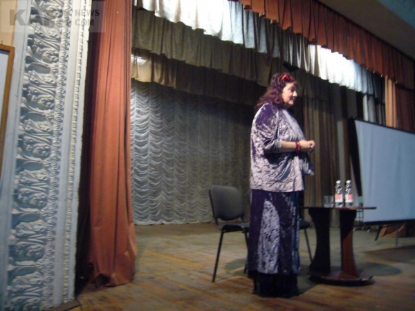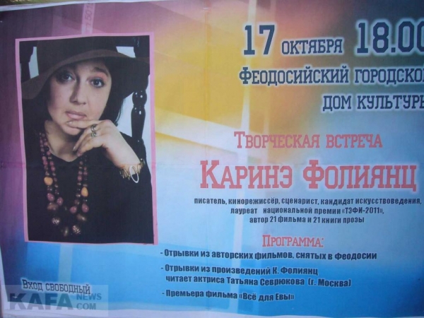 В среду, 17 октября в феодосийском городском Доме Культуры прошла творческая встреча с кинорежиссером и писателем Каринэ Фолиянц. Начался вечер с минуты молчания. Собравшиеся почтили память жертв керченской трагедии, произошедшей несколькими часами ранее. Далее мероприятие проходило по скорректированной, в связи с объявленным в Крыму трауром, программе. Однако при этом оно ничуть не потеряло своей душевности, познавательности и неподдельного интереса у публики.
